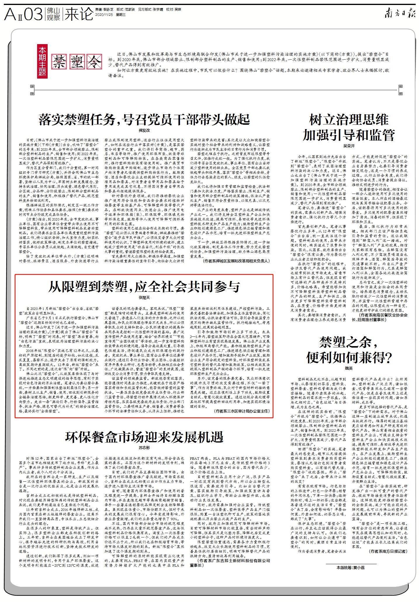 近日,佛山市发展和改革局与市生态环境局联合印发《佛山市关于进一步加强塑料污染治理的实施方案》(以下简称《方案》),提出“禁塑令”目标。到2020年底,佛山市部分领域禁止、限制部分塑料制品的生产、销售和使用;到2022年底,一次性塑料制品禁限范围进一步扩大,消费量明显减少,替代产品得到有效推广。 如何让方案更有效地实施?在实施过程中,市民可以做些什么?围绕佛山“禁塑令”话题,本期来论邀请相关专家学者、政企界人士来稿探讨,敬请垂注。