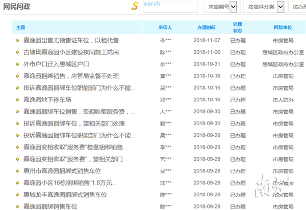 不单是南方+后台投诉,位于惠城区古塘坳区域的嘉逸园楼盘捆绑停车位销售行为在多个网络平台都成为热点。记者在惠州市房管局网络问政平台注意到,署名为“黄先生”“吴女士”“期盼安居的人”等多位市民均多次发帖投诉。仅在9月份和10月份,总计投诉网贴数量就超过了20份。