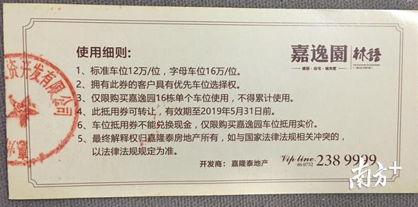 在该局的网络问政网贴回复中,该局介绍,经约谈开发企业,企业回复称:嘉逸园二期项目在销售前,大部分准业主提出能否优先选配车位,因当时地下室尚未施工完善,无法确定具体车位位置,故根据大部分准业主要求,每户准业主都能享受到优惠购买车位的政策,提供了1.8万元抵3万元的车位抵用券,享有优先选购车位权,并限制了车位上限价格,若没有该券以后车位价格有可能按市场价格调高。