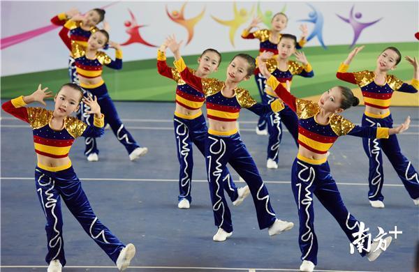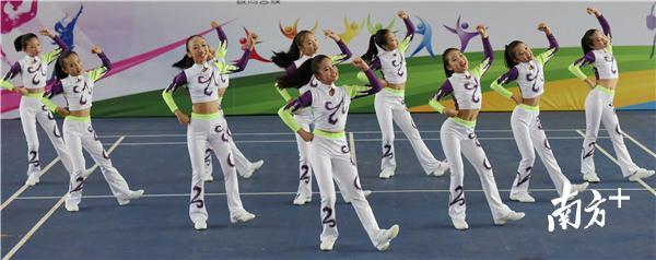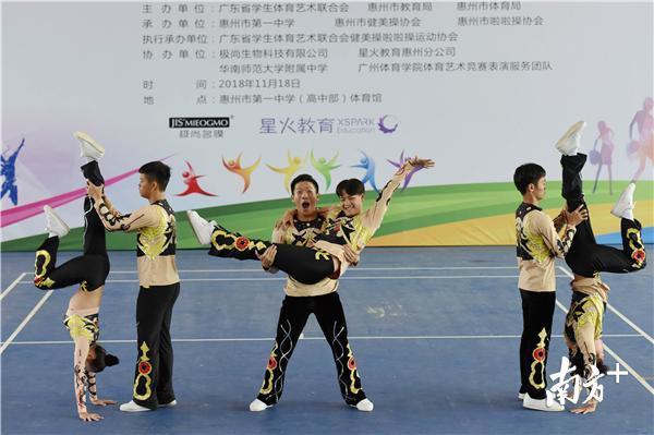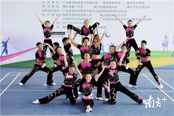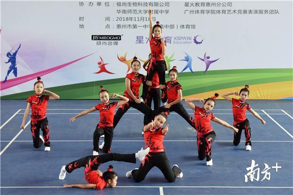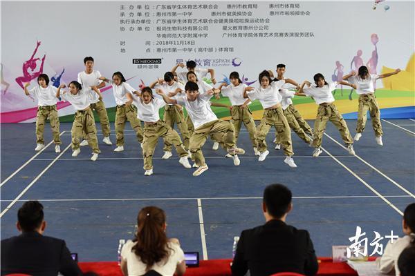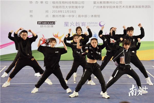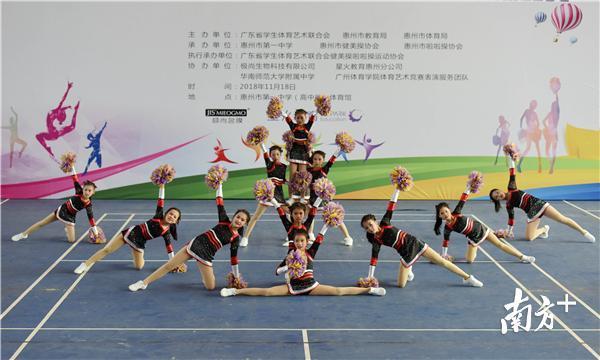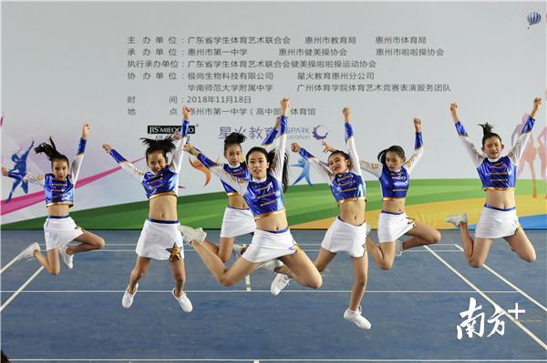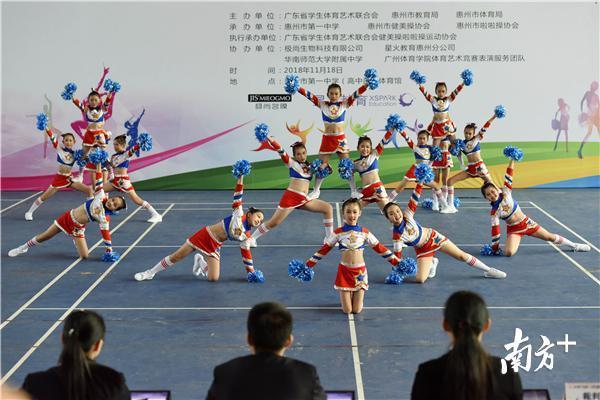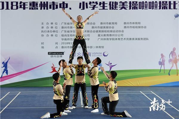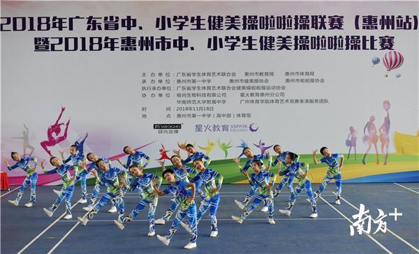 18日,在惠州一中高中体育馆,2018年广东省中、小学生健美操啦啦操联赛惠州站暨2018年惠州市中小学生健美操啦啦操比赛在这里举办,来自惠州、深圳两地的51所中小学校2000多名运动员参加角逐。联赛由广东省学生体育艺术联合会、惠州市教育局和惠州体育局联合主办,惠州市第一中学、惠州市健美操协会、惠州市啦啦操协会承办。