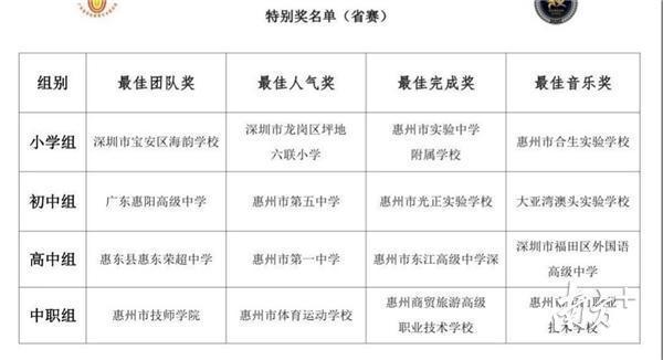 经过一天的紧张比拼,深圳市龙岗区坪地六联小学、惠州市光正实验学校、惠东县惠东荣超中学和惠州市技师学院分别获得联赛小学组、初中组、高中组和中职组团体总分第一名。另外还分别评出了不同组别的最佳团队、最佳人气、最佳完成和最佳音乐等奖项。