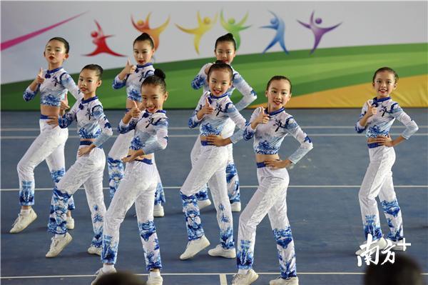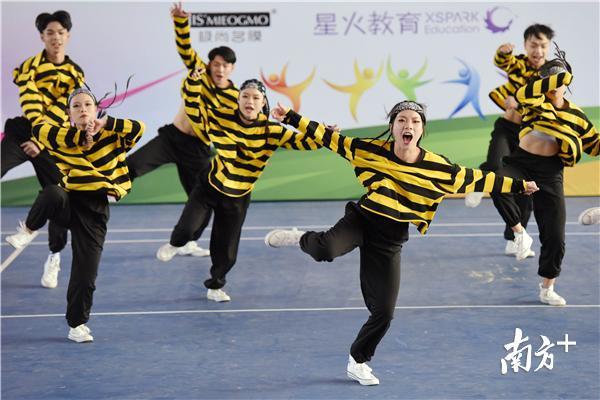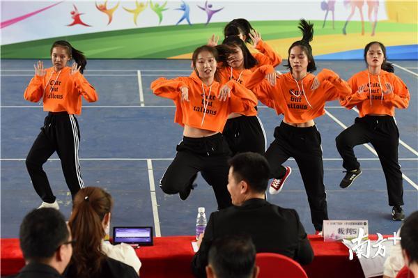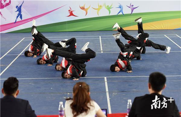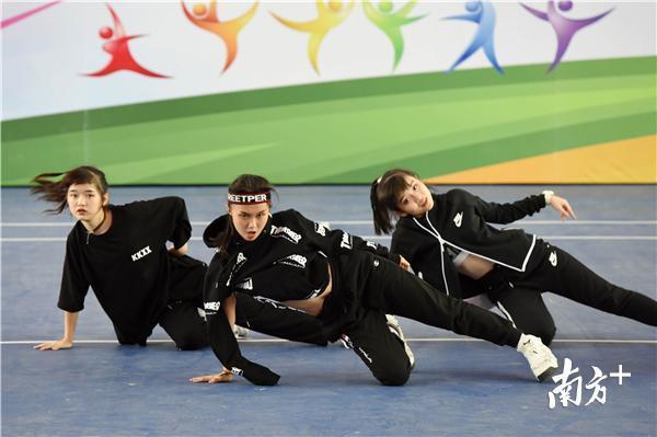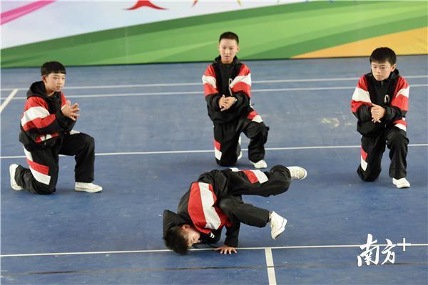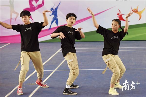 一首活力十足的Popping舞曲响起,迅速点燃现场的气氛,“哇塞,好帅!”“跳得不错啊!”站在C位的男生跳出酷似机器人的节奏,跳跃、停顿、摆臂,三个女生站定、回头,单手比出“手枪”的姿势,“机器人”倒地……场上尖叫声、掌声不断。这个由惠州市光正实验学校一队带来的街舞自选套路小集体项目,最终在初中组中获得单项第一名。