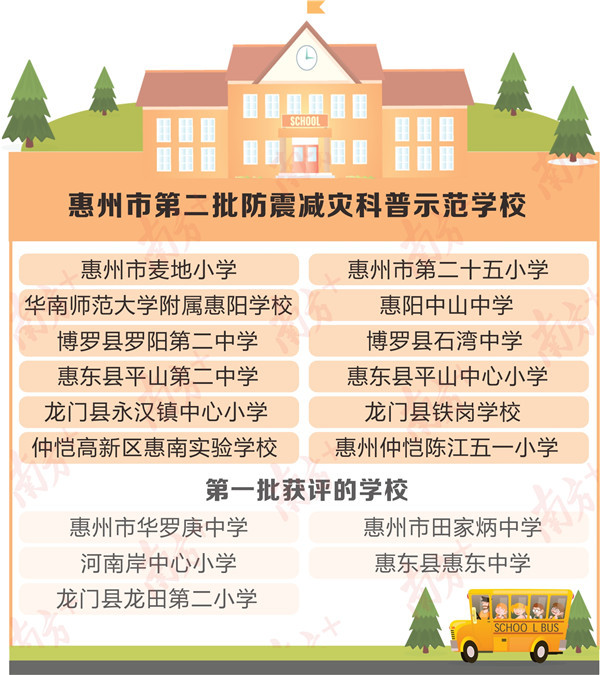 日前,记者从惠州市教育局获悉,惠州有12所学校被认定为第二批防震减灾科普示范学校。这12所学校包括惠州市麦地小学、惠州市第二十五小学和华南师范大学附属惠阳学校等,分布在惠城区、惠阳区、博罗县、惠东县、龙门县和仲恺高新区等6个县区,每个县区2所。加上第一批获评的5所学校,惠州目前共有17所学校成为防震减灾科普示范学校(详见下图)。