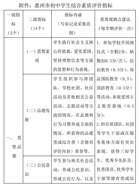为贯彻落实广东省教育厅《关于实施初中学生综合素质评价的指导意见(试行)》(粤教基〔2018〕10号)等文件精神,落实立德树人根本任务,发展素质教育,培养新时代创新型人才,结合实际推进我市义务教育均衡发展,现制定惠州市初中学生综合素质评价实施意见。
