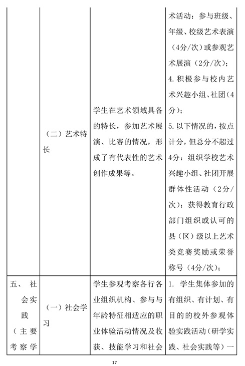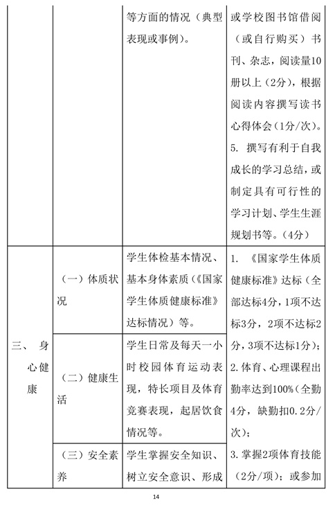 1.各县(区)要积极推行基于写实记录、评语评价和重要观测点计分评价的学生综合素质等级评价模式,根据学生综合素质发展的个体水平和相对差异分别赋予不同的等级,作为学生综合素质评价的结果。学校开展综合素质评定工作,每学期末举行一次。根据每学期末计分情况得出评价结果,分A、B、C、D、E五个等级:15-20分为A等,11-14分为B等,7-10分为C等,3-6分为D等,0-2分为E等。