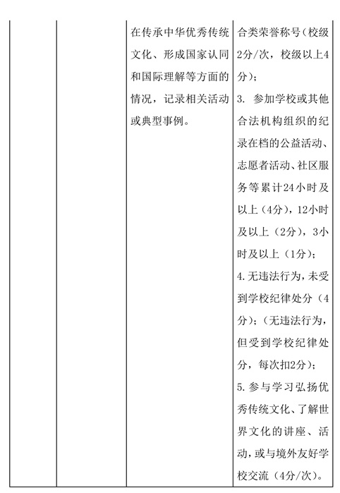 主要考察学生在践行社会主义核心价值观,在爱党爱国、理想信念、责任担当、热爱集体、遵纪守法、诚实守信、行为习惯等方面的表现,重点记录学生思想素质与品德发展方面的表现,如学习弘扬优秀传统文化、接受法治教育和国防教育、参与学校班团队活动、社团活动、公益劳动、社区服务、志愿服务等。