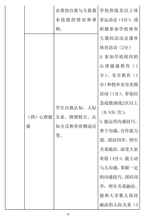 主要考察学生的基本身体机能与运动技能、体育锻炼习惯与健康生活方式,以及心理健康状况、健康素养、安全素养等。重点是《国家学生体质健康标准》达标情况,体育运动技能掌握情况、每天一小时校园体育活动表现及课余体育训练情况、健康生活方式养成,以及自我认知、人际关系、情绪特点、认知方式和青春期适应,卫生与健康知识与技能、安全知识、安全意识与相关技能等。