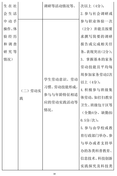 主要考察学生在社会生活中动手操作、体验探究和调查研究,形成的劳动意识和劳动技能等情况。重点是生活技能、劳动实践、职业体验、参观学习、研学实践和调查研究等实践活动的经历、能力和成果,以及在创新意识、创新能力方面的表现等。