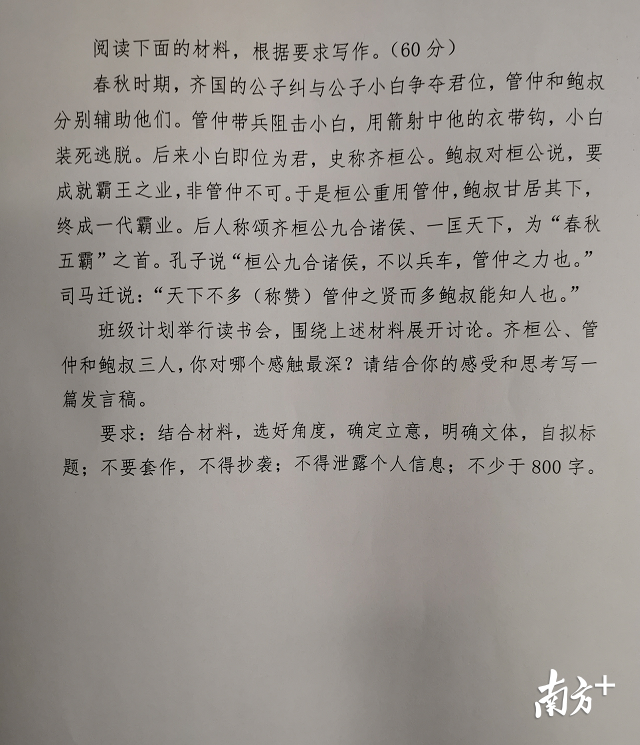 7月7日上午,随着语文考试的结束,备受关注的广东高考作文随之揭晓。“齐桓公、管仲和鲍叔三人,你对哪个感触最深?”今年高考作文要求考生阅读材料,结合自己的感受和思考写一篇发言稿。