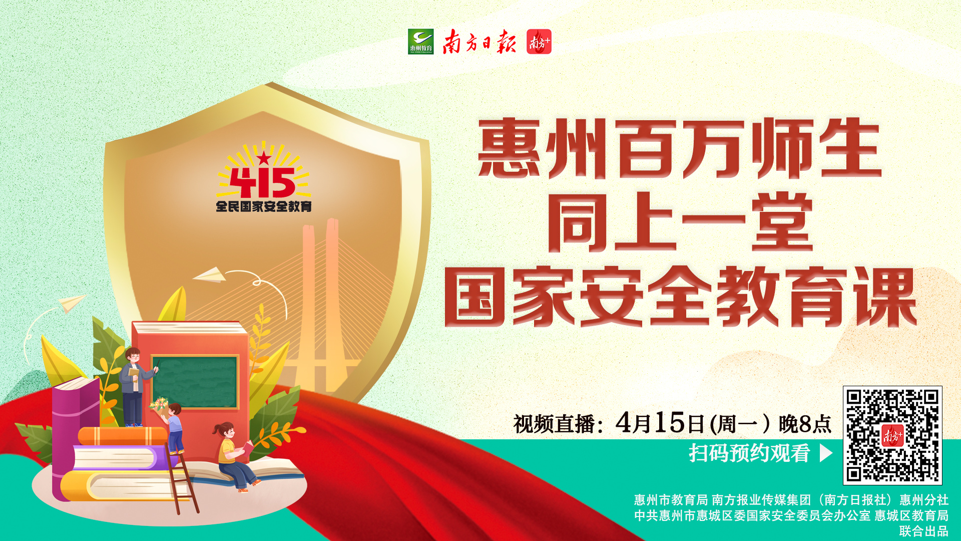 为贯彻总体国家安全观,深入开展国家安全宣传教育,4月15日晚8时,惠州市教育局、南方报业传媒集团惠州分社、惠城区教育局、中共惠州市惠城区委国家安全委员会办公室将联合推出国家安全教育公开课。