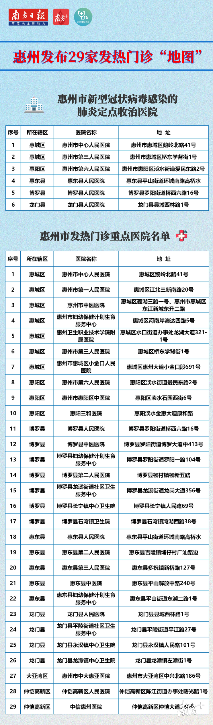 1月23日晚,惠州市卫生健康局公布了6家新型冠状病毒感染的肺炎市级定点收治医院名单,包括惠州市中心人民医院、惠州市第三人民医院、惠州市第六人民医院、惠东县人民医院、博罗县人民医院和龙门县人民医院。