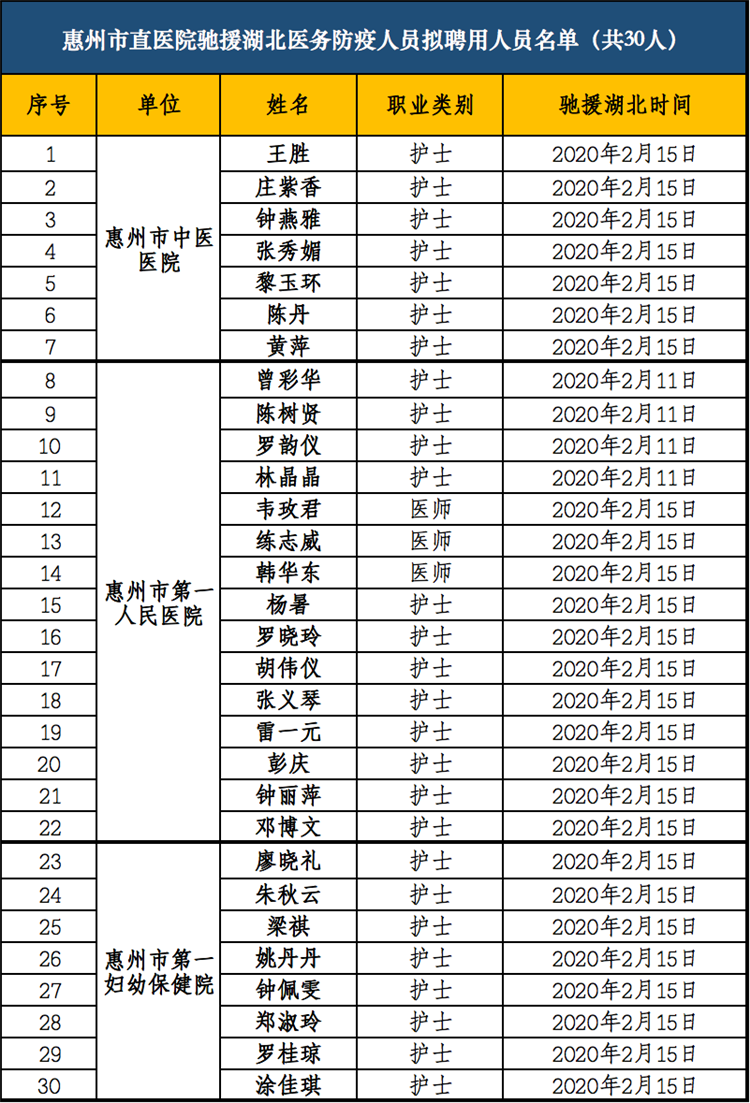 3月11日,惠州市人力资源和社会保障局与惠州市卫生健康局联合发布通告,对30名驰援湖北医务防疫人员考察招聘拟聘用人员名单进行公示。