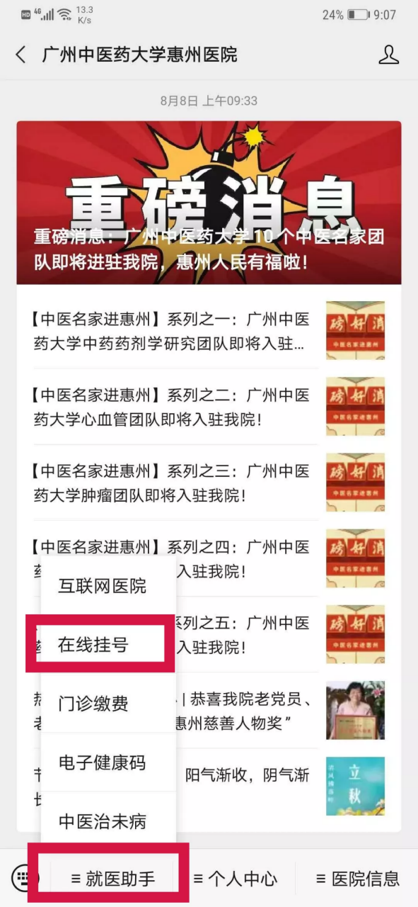 第二步:点击菜单栏“就医助手”,进入“在线挂号”;