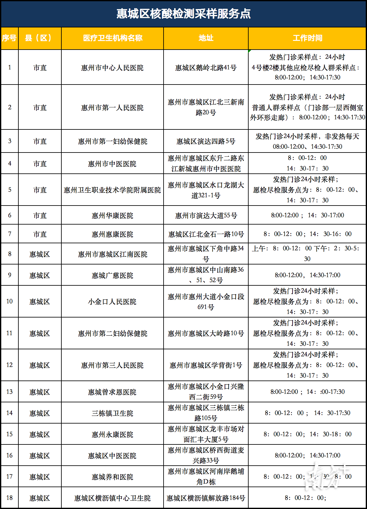 记者从惠州市卫生健康局了解到,惠城区目前共有18家医疗卫生机构开展核酸检测采样工作,市民可预约后前往接受核酸检测。具体名单如下: