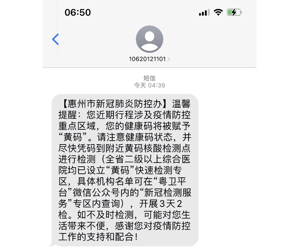 在8月16日晚报告1例确诊病例后,17日凌晨,惠州不少市民收到市新冠肺炎防控办发出的手机短信——“您近期行程涉及疫情防控重点区域,您的健康码将被赋予‘黄码’。”