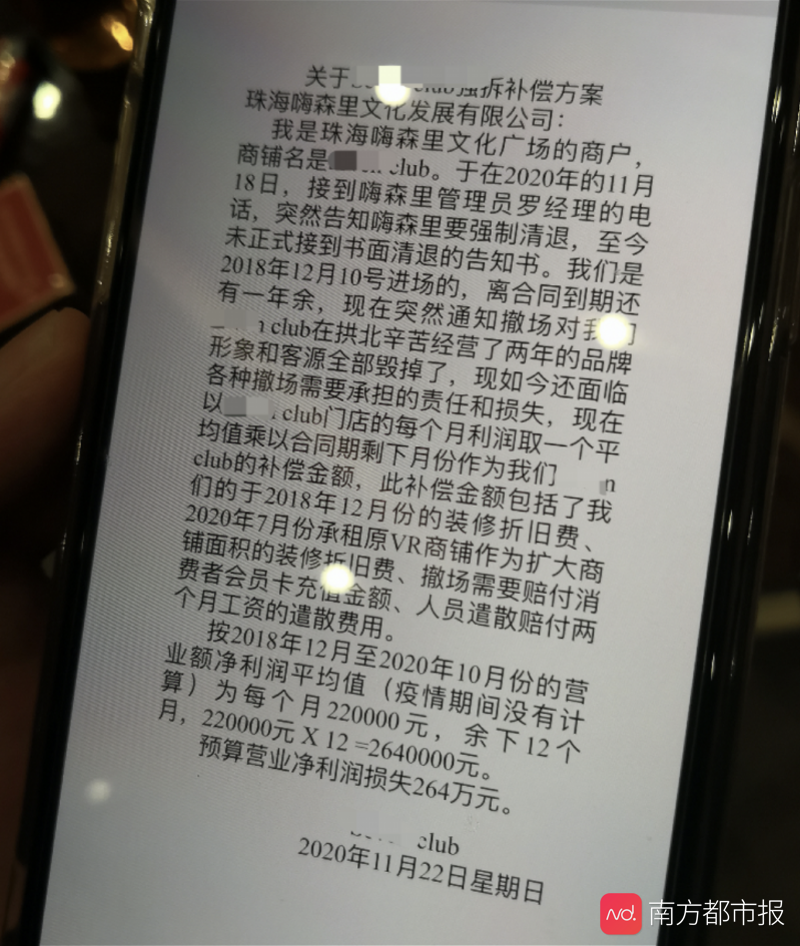 嗨森里文化发展有限公司总经理刘伟解释,其实在合约中,双方已经约定,由于政府行为导致场地无法使用,合同不能继续履约的,双方互不承担责任。此外,他表示,公司已经给出极大的诚意,包括回购店铺的设备,赔偿装修费、员工的遣散费,店铺损失等,“甚至把他们之前的租金全部返还”,“但凡是在合理范围内的,都在尽最大诚意与对方达成协议,但部分商户要价太不合理,有的还要求赔偿还没发生的2021年的营业额,而且存在隔天就加价的情况,实在无法接受”。