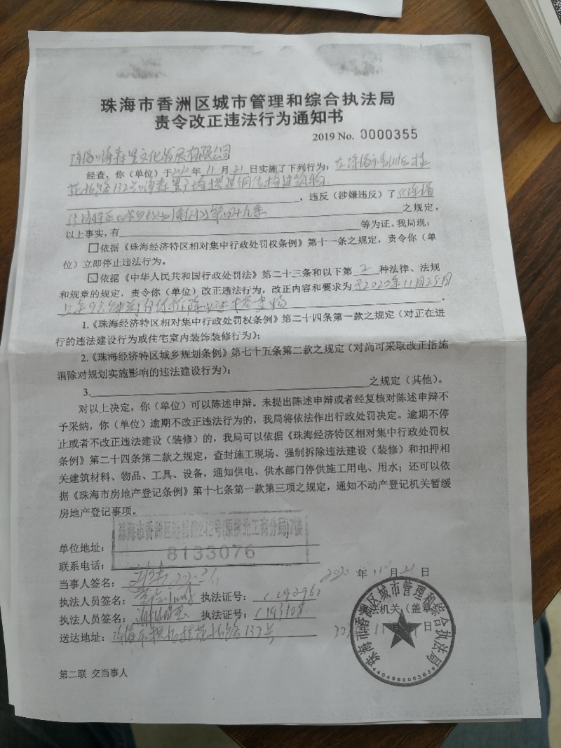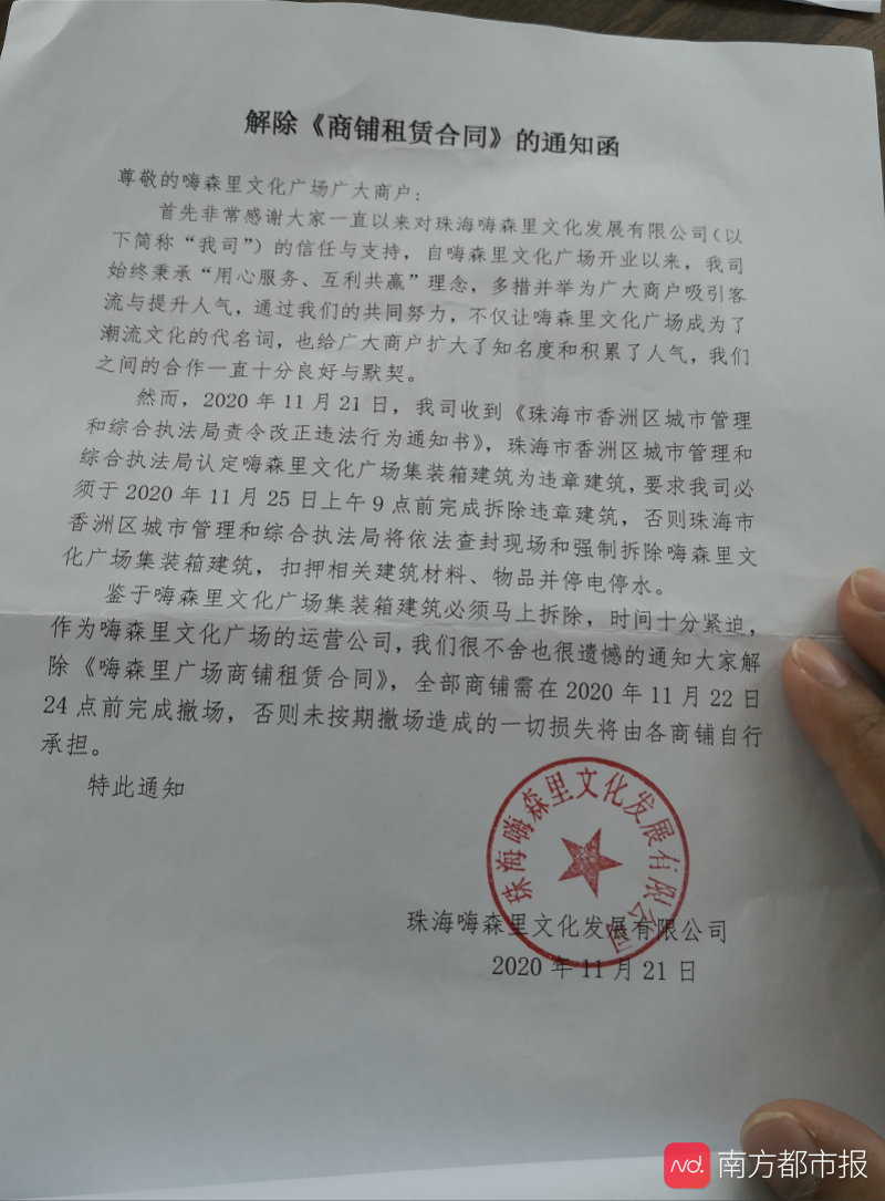 日前,位于珠海香洲区桂花北路的嗨森里文化广场的商户们接到了管理方的一纸通知,通知称,2020年11月21日,管理方珠海嗨森里文化发展有限公司收到了《珠海市香洲区城市管理和综合执法局责令改正违法行为通知书》,城管部门认定嗨森里文化广场相关建筑为违章建筑,要求必须于11月25日上午9点前拆除。因此,公司要求所有商户在11月22日24点前完成撤场,未按期撤场造成的一切损失由商户自行承担。