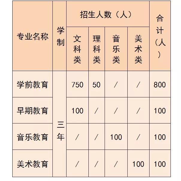 2019年起,学校根据社会对教育人才的需要,招收学前教育、早期教育、音乐教育、美术教育师范类专业共4个,计划招生共1100人。各专业招生计划如下表: