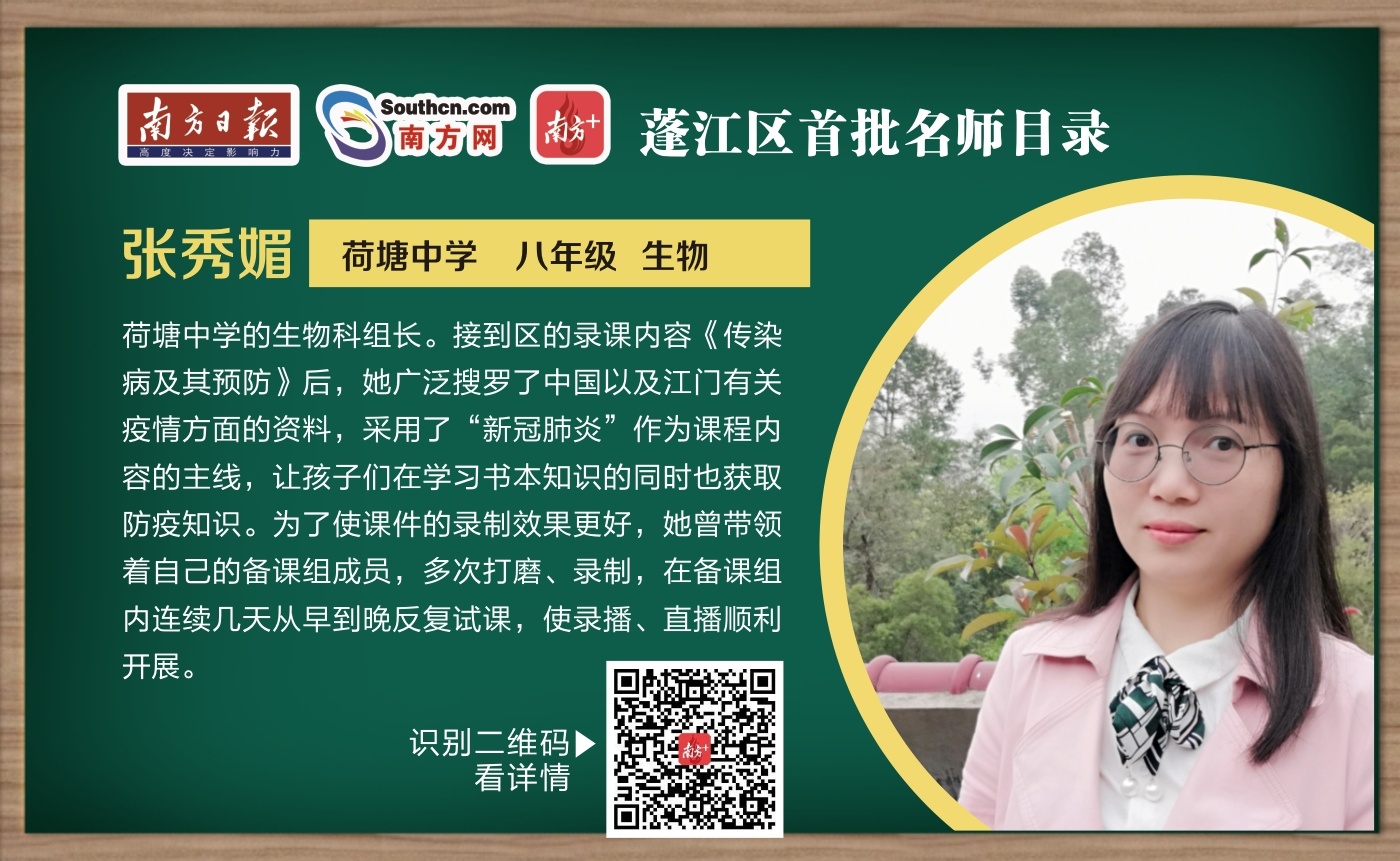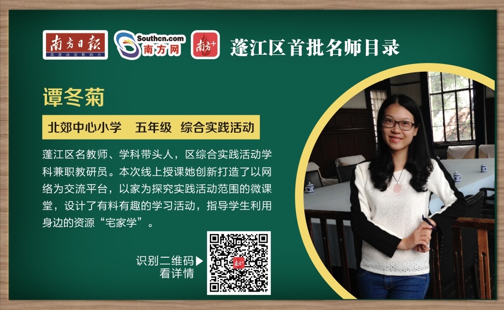 “本次线上授课我创新打造了以网络为交流平台,以家为探究实践活动范围的微课堂,设计了有料有趣的学习活动,指导学生利用身边的资源‘宅家学’。”蓬江区名教师谭冬菊向记者介绍她为“停课不停学”准备的视频网课。