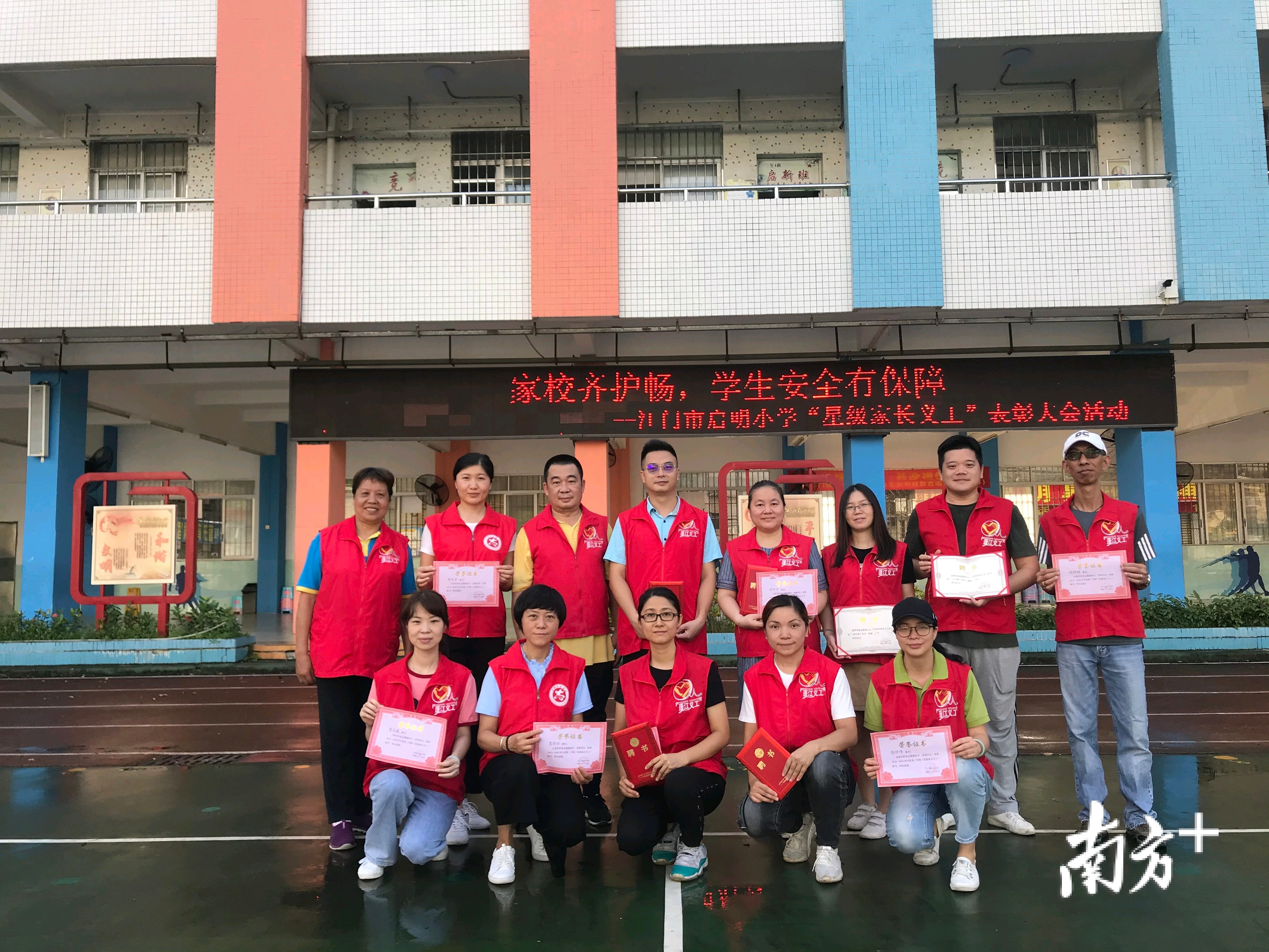 在江门市启明小学校园内外,有这样一群人,他们迎着朝晖与晚霞,不管大雨滂沱还是烈日炎炎,总是面带微笑,迎接孩子们上学、放学,维持着学校校门口的秩序,守卫着孩子们的安全。他们就是该校家长义工。