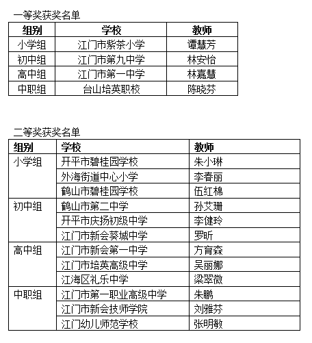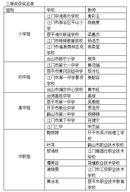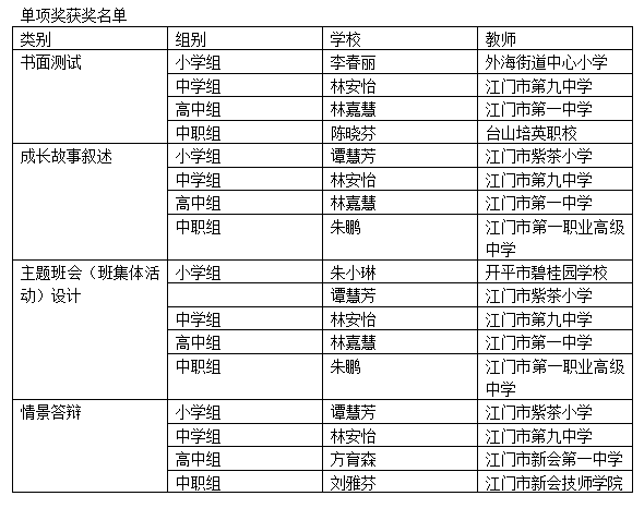 6月23日下午,第八届江门市中小学班主任专业能力大赛正式闭幕。江门市紫茶小学的谭慧芳、江门市第九中学的林安怡、江门市第一中学的林嘉慧以及台山培英职校的陈晓芬共4名教师斩获一等奖。