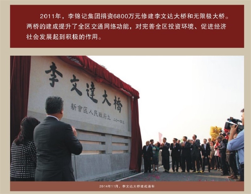 他以李锦记集团名义,捐资人民币6800万元建设的“李文达大桥”和“无限极大桥”,于2011 年12月18日举行隆重的开工奠基仪式。建桥是一项大工程,李文达对其进度非常在意,不但经常常询问有关负责人员,还常嘱咐子女们多关心多支持。