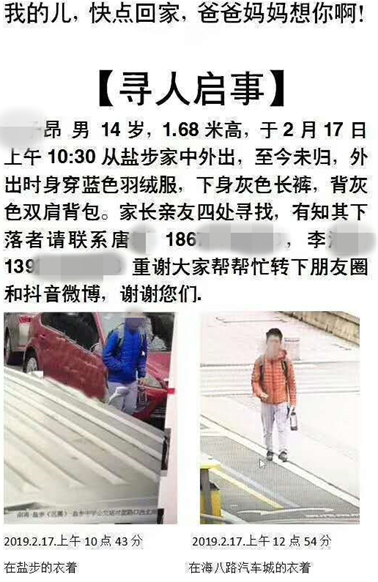 备注:由于失联男孩已找到,故整篇文章中隐去该男孩具体姓名、联系电话等,男孩称为小昂。