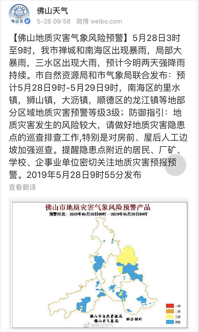 5月28日3时至9时,佛山市禅城和南海区出现暴雨,局部大暴雨,三水区出现大雨,预计今明两天强降雨持续。佛山市自然资源局和市气象局联合发布:预计5月28日9时-5月29日9时,南海区的里水镇,狮山镇,大沥镇,顺德区的龙江镇等地部分区域地质灾害预警等级3级;防御指引:地质灾害发生的风险较大,请做好地质灾害隐患点的巡查排查工作,特别是对房前、屋后人工边坡加强巡查。提醒隐患点附近的居民、厂矿、学校、企事业单位密切关注地质灾害预报预警。
