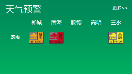 目前,禅城区、南海区、高明区、三水白坭正悬挂暴雨橙色预警信号,南海区雷雨大风黄色预警信号也在生效中,三水西南、云东海,顺德区均安、龙江正悬挂暴雨黄色预警信号。