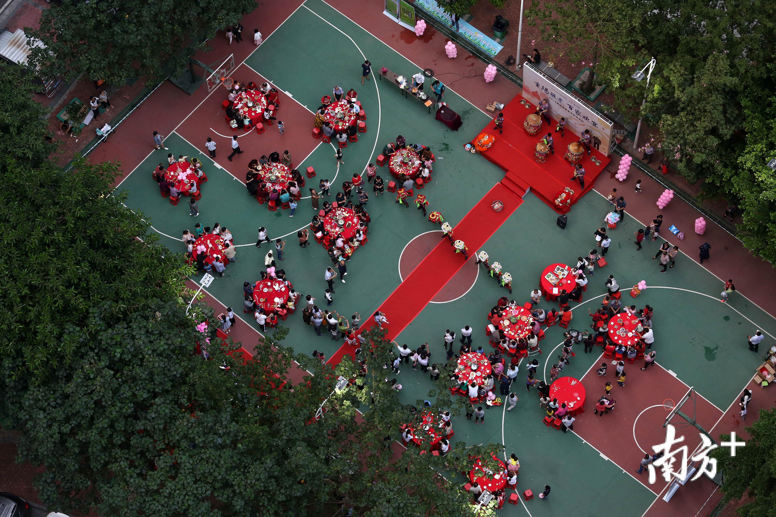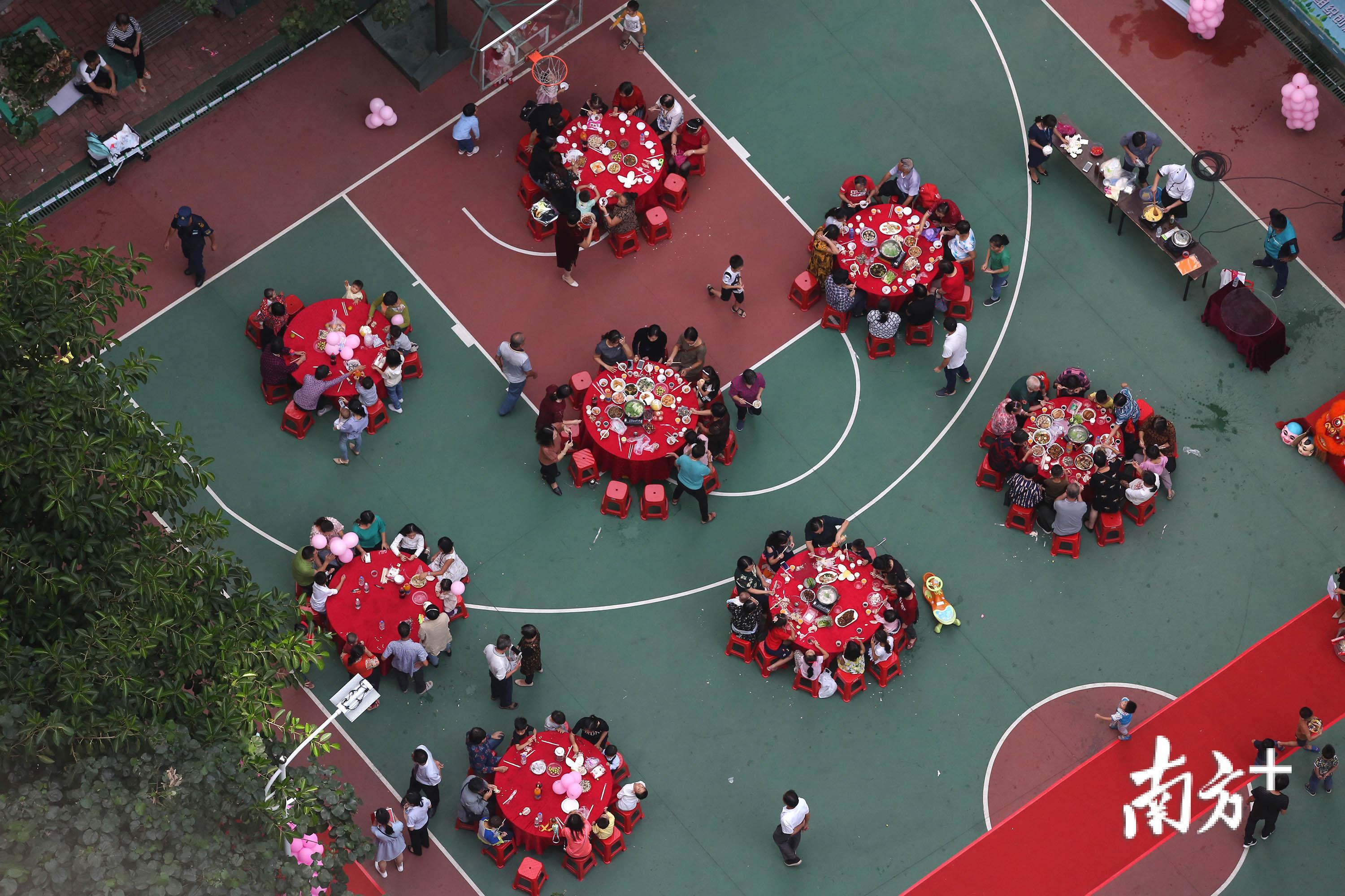 “每家一份菜,凑成一桌席”,一张张圆桌上摆满了各式各样的菜肴,粤菜、川菜、湘菜……荤菜、素菜、水果饮料一应俱全。居民们一边观看着表演,一边围着圆桌品尝着各家送来的美味佳肴。