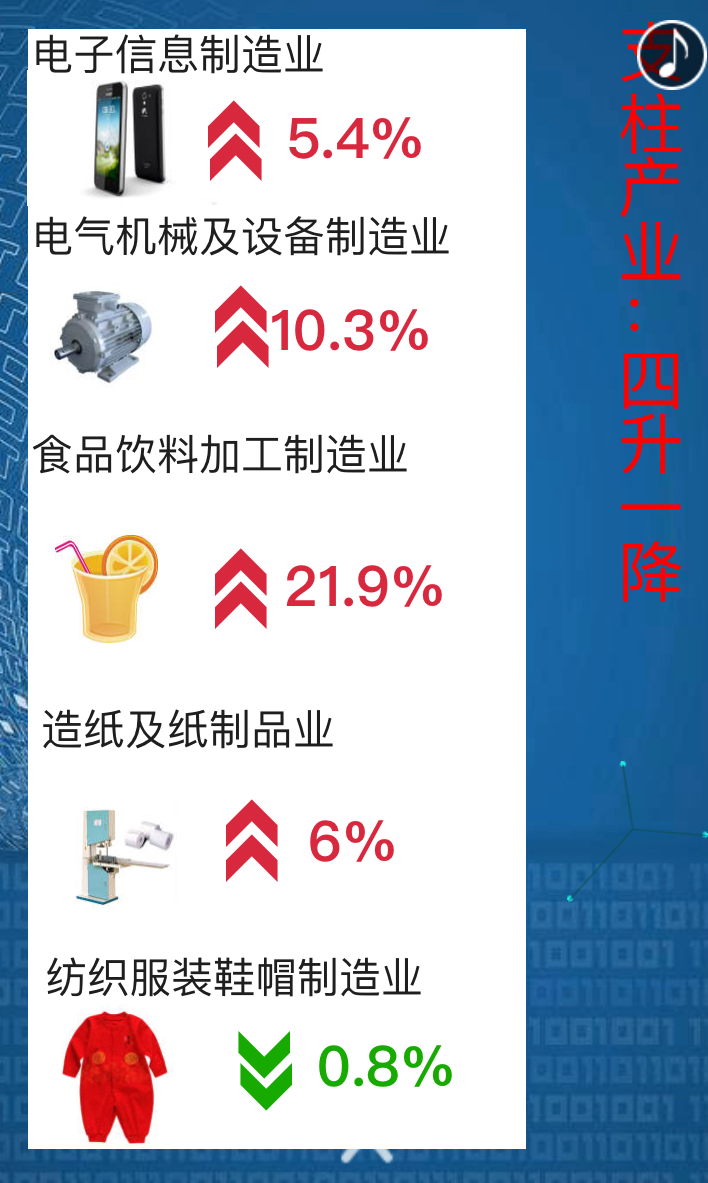 报告显示,一季度,东莞九大产业除纺织服装和家具外保持正增长,电子信息、电气机械贡献率最高。其中支柱产业呈现“四升一降”的发展态势。从产业来看,电子信息产业同比上升5.4%,电气机械及设备制造业同比上升10.3%,食品饮料加工制造业同比上升21.9%,造纸及纸制品业同比上升6%,纺织服装鞋帽制造业同比下降0.8%。