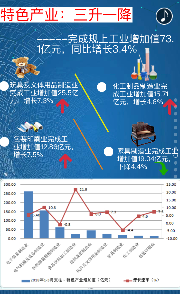 而四大特色产业一季度完成规上工业增加值73.1亿元,同比增长3.4%,总体则呈现“三升一降”的态势。其中玩具及文体用品制造业完成工业增加值25.5亿元,增长7.3%;化工制品制造业完成工业增加值15.71亿元,增长4.6%;包装印刷业完成工业增加值12.86亿元,增长7.5%;家具制造业完成工业增加值19.04亿元,下降4.4%。
