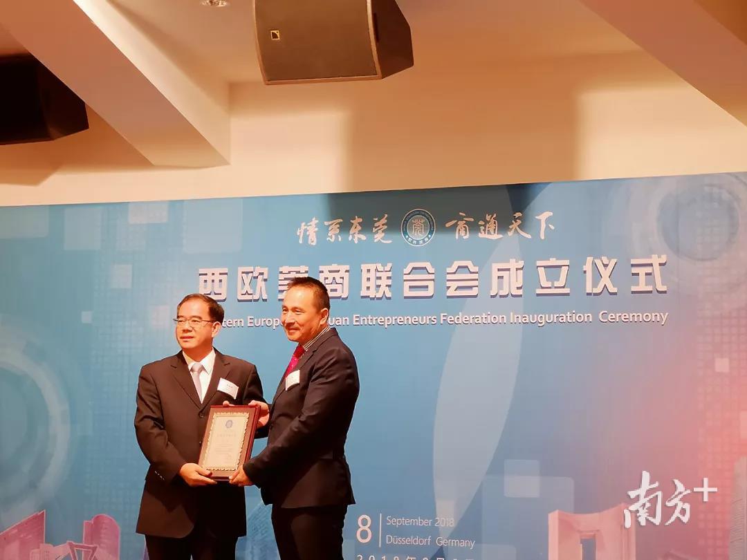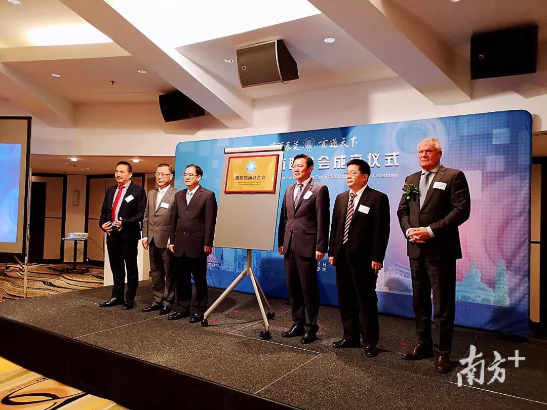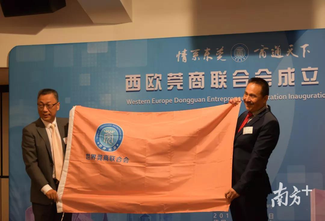 成立仪式上,梁维东向当选会长、祖籍东莞现任德国双源医疗有限公司董事长叶森授予牌匾;张冠梓向西欧莞商联合会授予会徽;尹洪卫向西欧莞商联合会授予会旗以及20万元人民币开办费;仪式上还进行了荣誉会长、名誉会长、荣誉顾问、常务副会长、副会长、秘书长的牌匾颁发仪式。冯海阳、梁维东、张冠梓、尹洪卫、叶森、Helmut Schwesig共同为西欧莞商联合会揭牌。