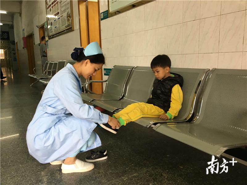 2019年5月9日,桥头镇李朗社区卫生服务站像往常一样迎来一批节后前来就诊的患者。忙碌之余,李锦霞护士发现一名无人陪伴的儿童,主动上前询问家长信息,帮助幼儿穿好鞋袜。此时此刻,我就是你的守护人。