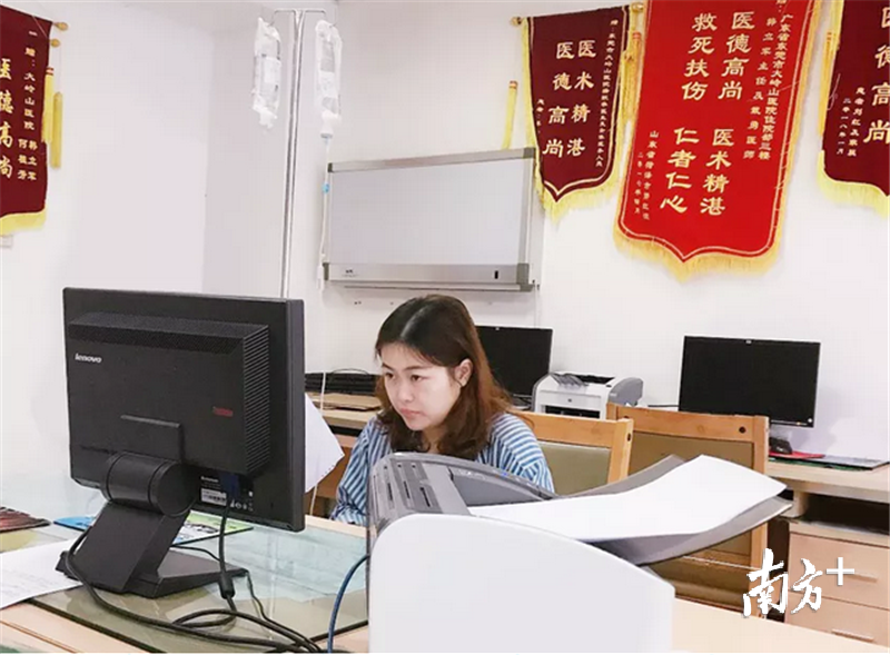 2019年4月22日,大岭山医院护士邝艳华患上阑尾炎,进行了手术。术后第三天,手上还打着点滴的她返回科室请假时,看到科内同事忙,竟又坐在电脑旁帮忙。她服务过的一个病人,看到她穿着病服、打着点滴还在工作,不禁为她点赞。