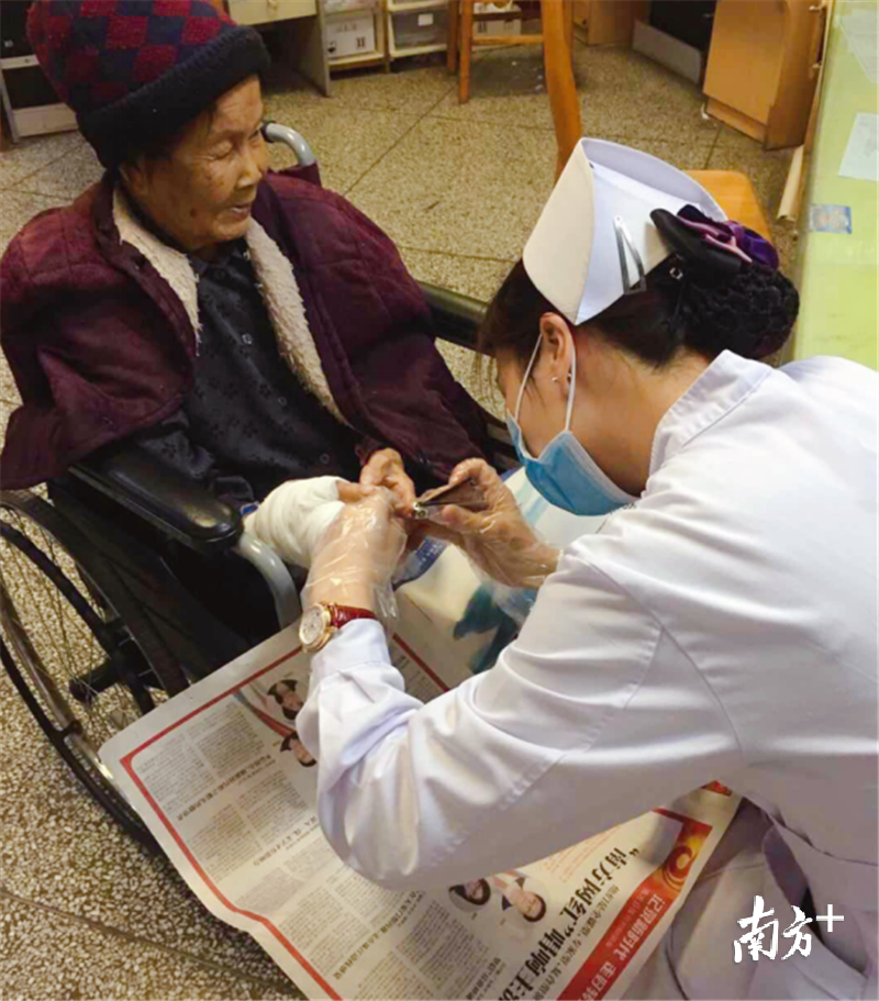 一位88岁高龄的老人家由于右手掌伤口感染入院,家里人送来住院就离开了,由于年龄大、右手不方便,指甲很长好长时间没剪过,东莞市常平医院护士刘慧芝细心的给她修剪指甲,老人家脸上洋溢着笑容,说:“我家闺女都没帮我剪过指甲,真是个暖心的姑娘!”