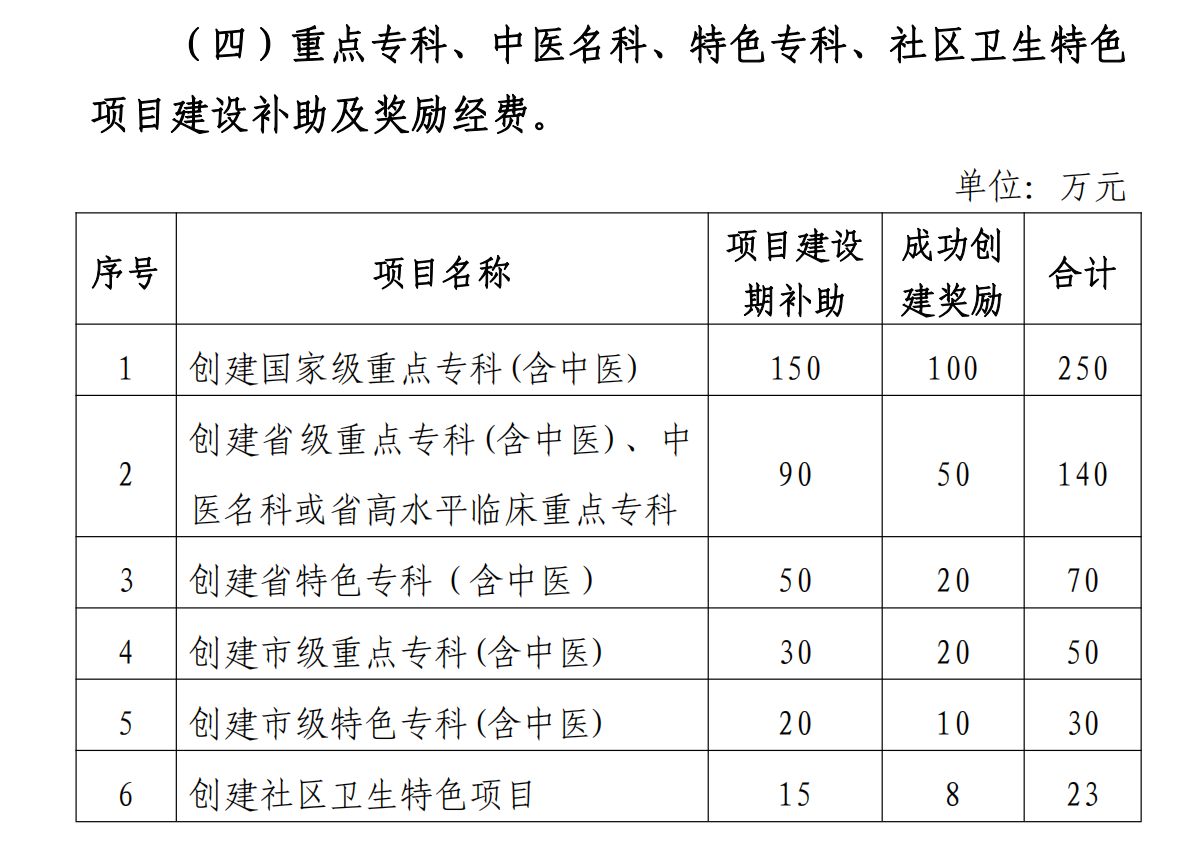 公立医院人才队伍培养及引进、重点专科建设,都将有专项资金进行补助,其中,当年获得《住院医师规范化培训合格证书》或《全科医生转岗培训合格证书》的学员,市财政将每人一次性补助1万院,公立医疗机构引进一名省级以上医学领军人才、国医大师、全国名中医,一次性补助50万元,分三批建设的50个市级名中医药专家传承工作室也将各补25万元。