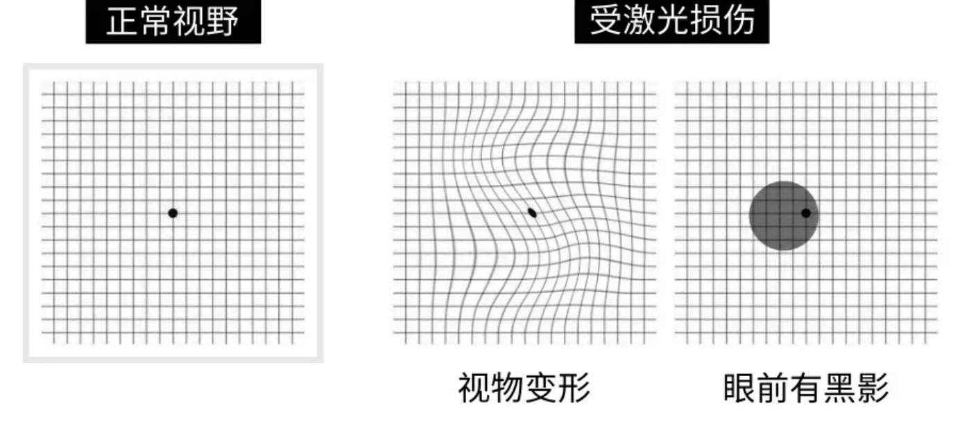 激光造成眼损伤时,会出现视物变形、变小、颜色变淡等症状,若黄斑区被激光灼伤,患者视野就出现了一个完全的盲区,眼前始终都有一个暗影。