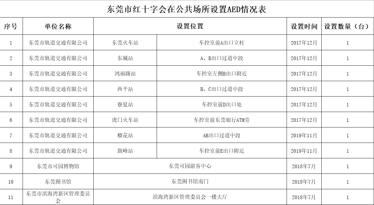 随后,全市的AED数量越来越多。到目前为止,由东莞市红十字会设置的AED已经达到29台,到今年底,这一数量将达到32台。