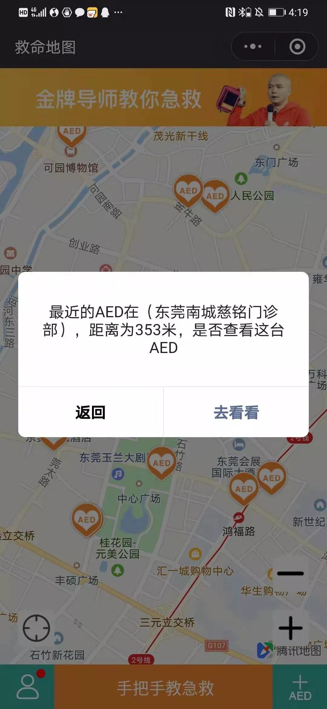 (“救命地图”小程序是“第一反应”与腾讯合作开发的应用,用户可使用该应用查询附近已登记的AED设备,也支持用户将未登记的AED设备上传到地图中。)