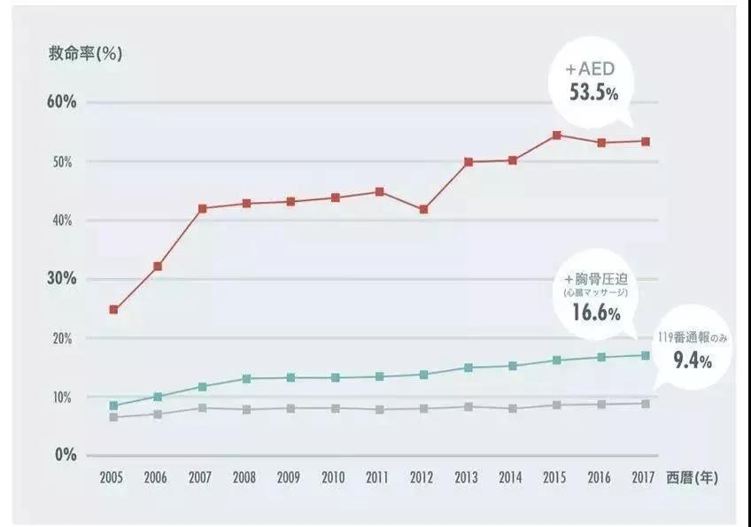当今,公共场所是否广泛设置AED已成为先进城市的重要标志。在欧美日等国家已经非常普遍,在所有的公共场合,如机场、码头、车站、商场、学校全部都有配备,甚至连大巴车、飞机等公共交通工具都有设置。日本2004年至2013年9年间AED约增加了40倍,急救成功率从7% 大幅增加到了38%,这都与公共场所不断普及的AED密不可分。