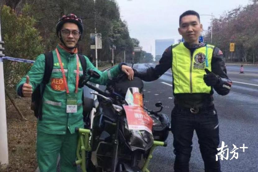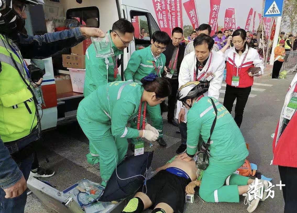“当时我也刚到终点,拿出手机给志愿者,让他帮忙拍照留念,突然听到人有人喊‘让开、让开’,回头一看,一位志愿者已经在帮忙按压。”大朗医院麻醉科医生詹堪善赶到易先生身边,发现他的嘴唇已经紫了。詹堪善赶紧为这名参赛者吹气,并为他继续按压。