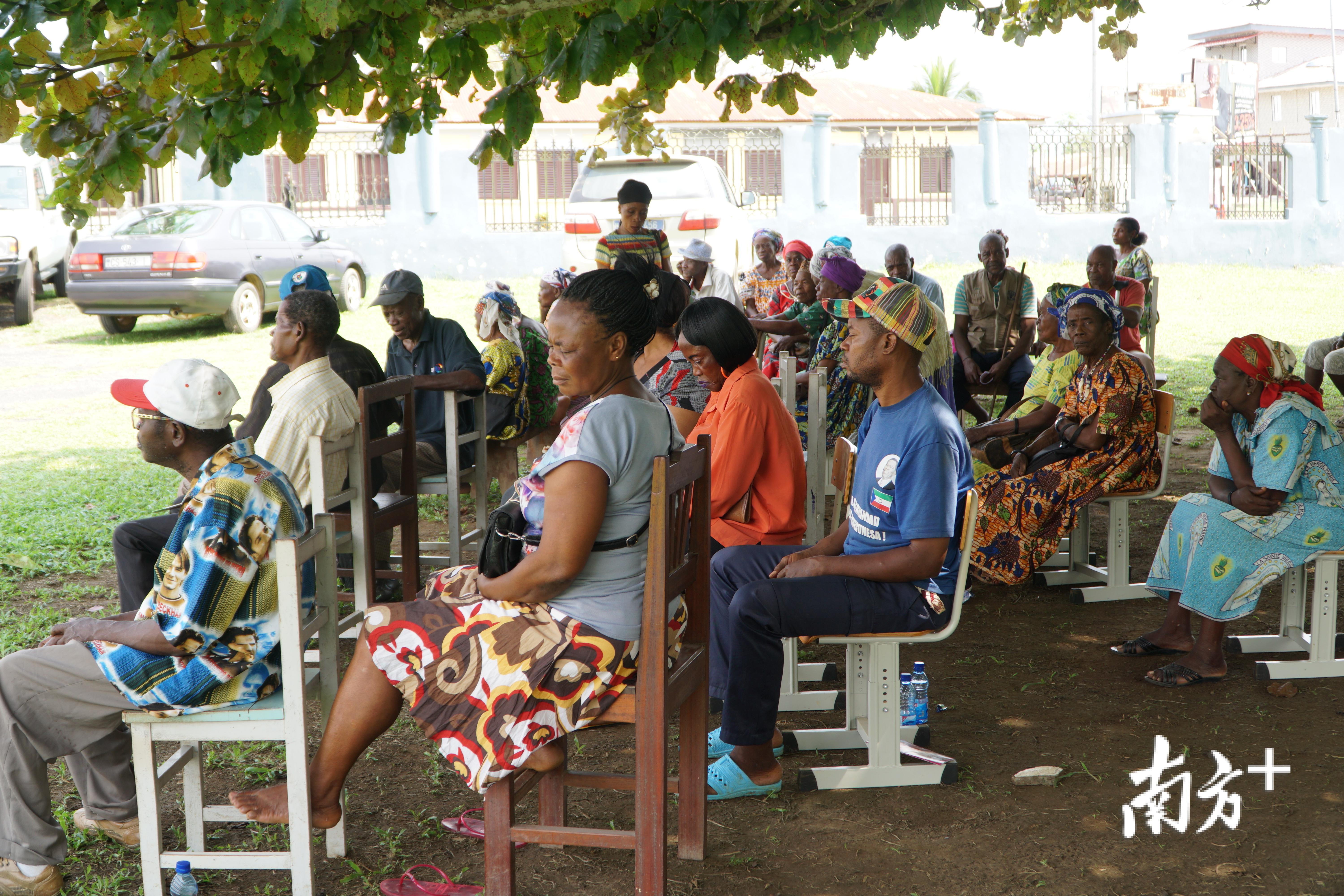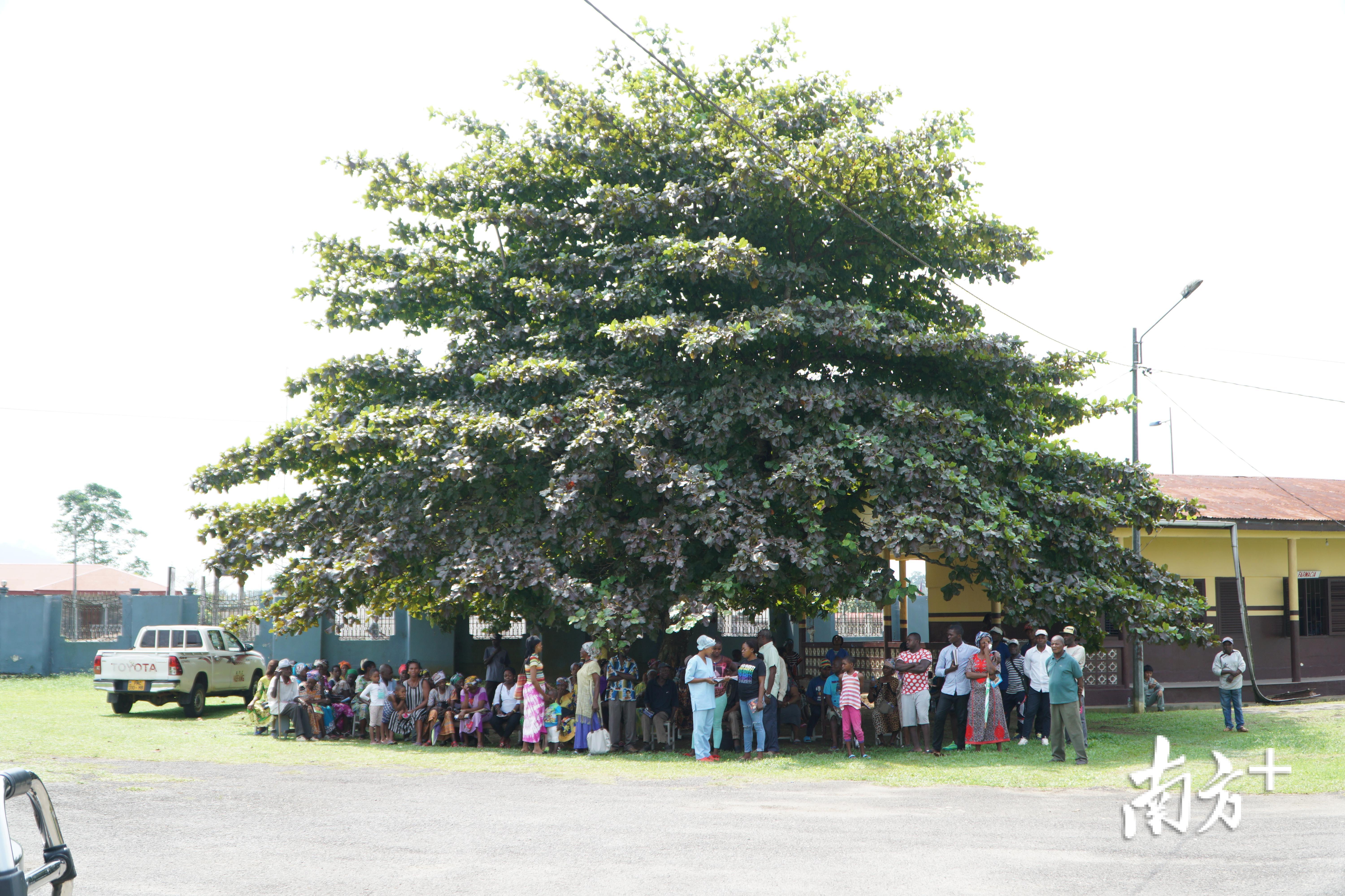 涅方位于赤几大陆中部贝尼托河畔,距离巴塔70公里,车程约1个半小时。医疗队员们早上8点就出发,刚到达,大家就受到了赤几总统驻涅方市代表、示范农场负责人、涅方医院院长及当地群众的热烈欢迎。当地群众见到医疗队员精神抖擞地走过来,大家都鼓起掌欢呼着“Doctor chino, muy bien! ”(中国医生,真好!)。原来,当地居民知道中国专家要来义诊,早早就来到涅方医院院子里,整齐地坐在树下排队,在十点前已经有近百人在等候。