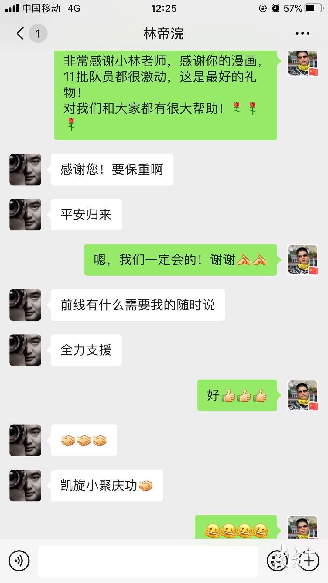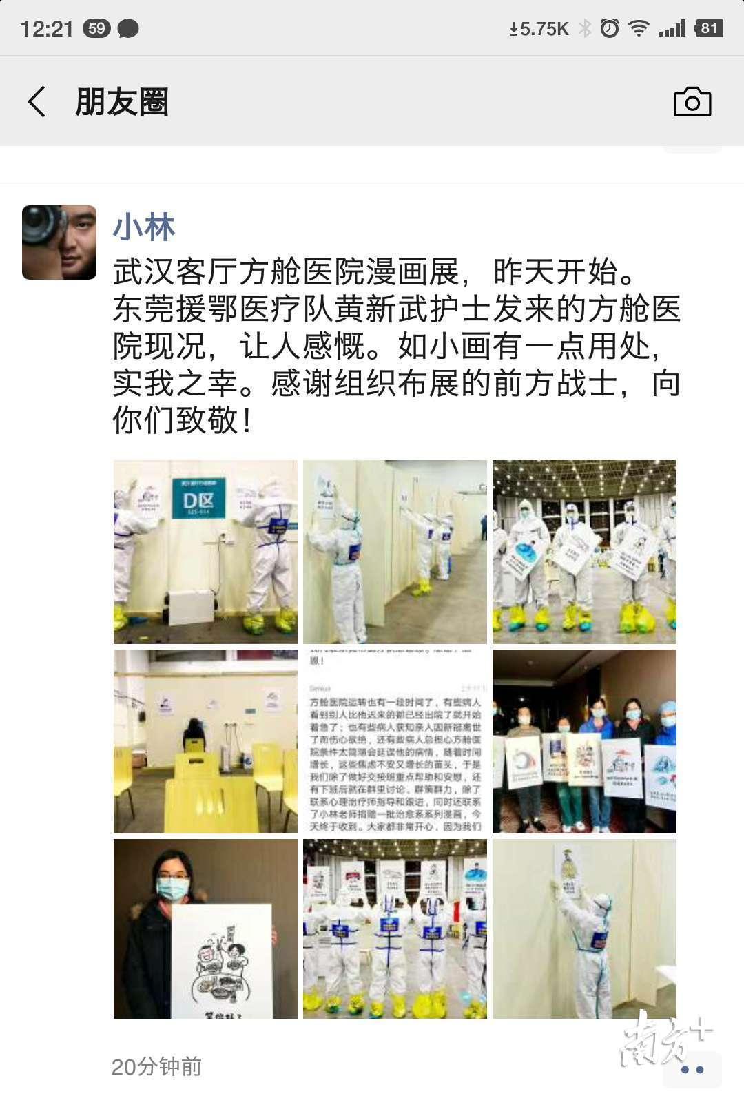 莫志宁告诉记者,他是小林老师的忠实粉丝,所有的漫画张贴好之后,他将这场漫画展拍下来,发给了小林老师,表示感谢。“小林老师”林帝浣将这些照片发布在自己的朋友圈,“如小画有一点用处,实我之幸。感谢组织布展的前方战士,向你们致敬!希望医护人员和病友们都能乐观面对,笑看艰难,早日胜利。”
