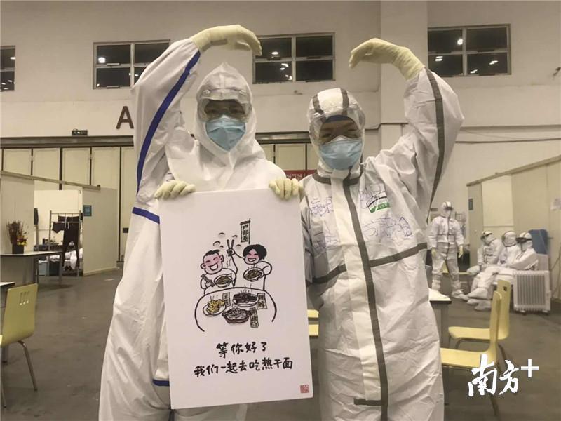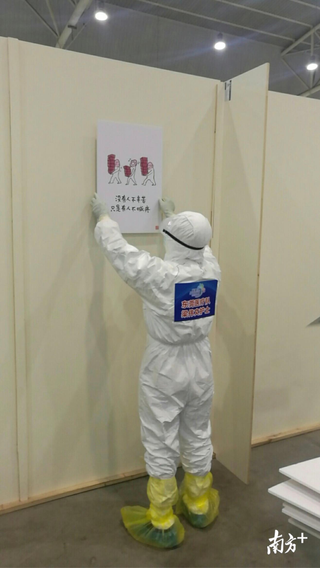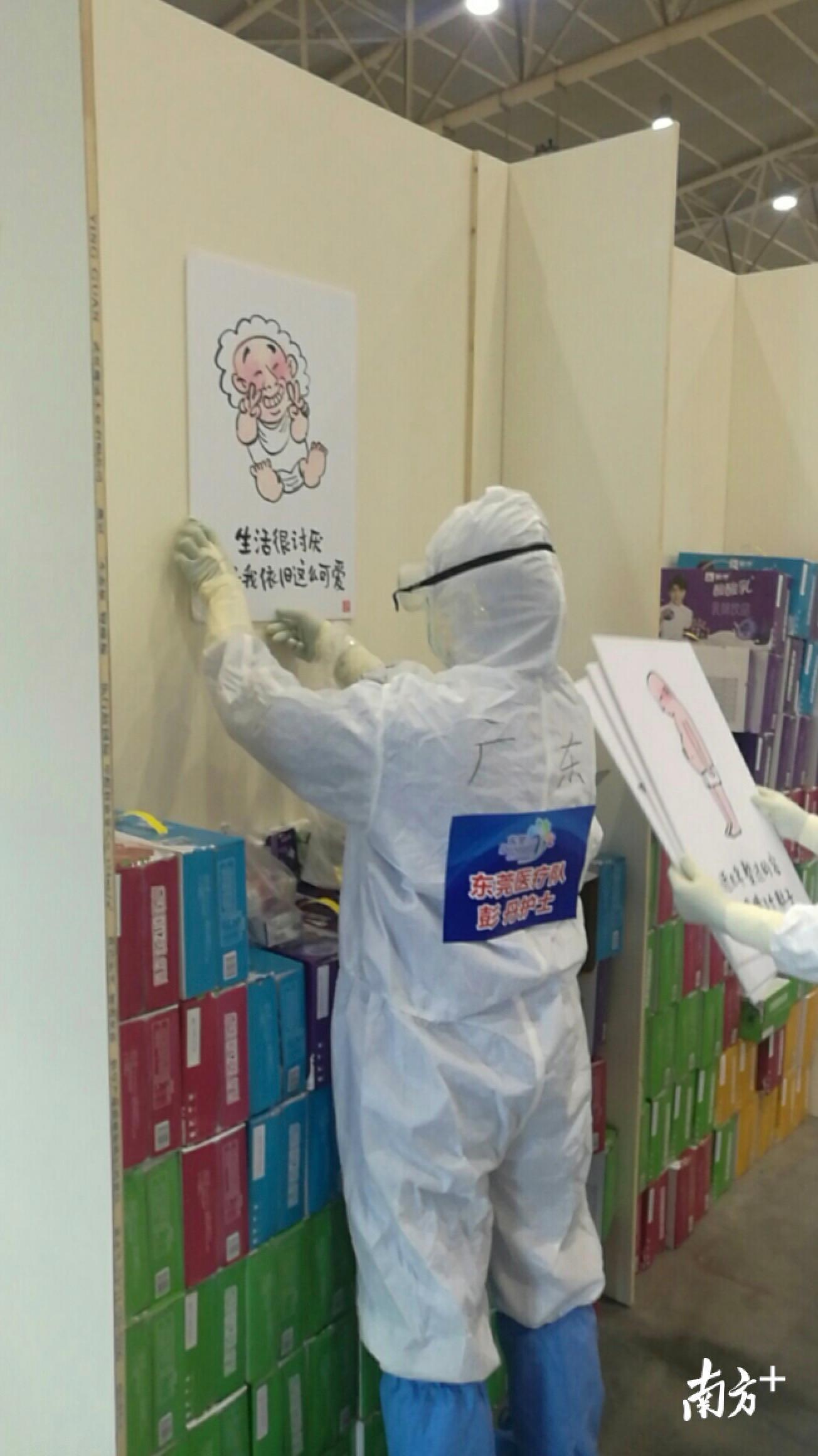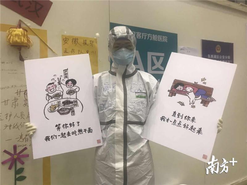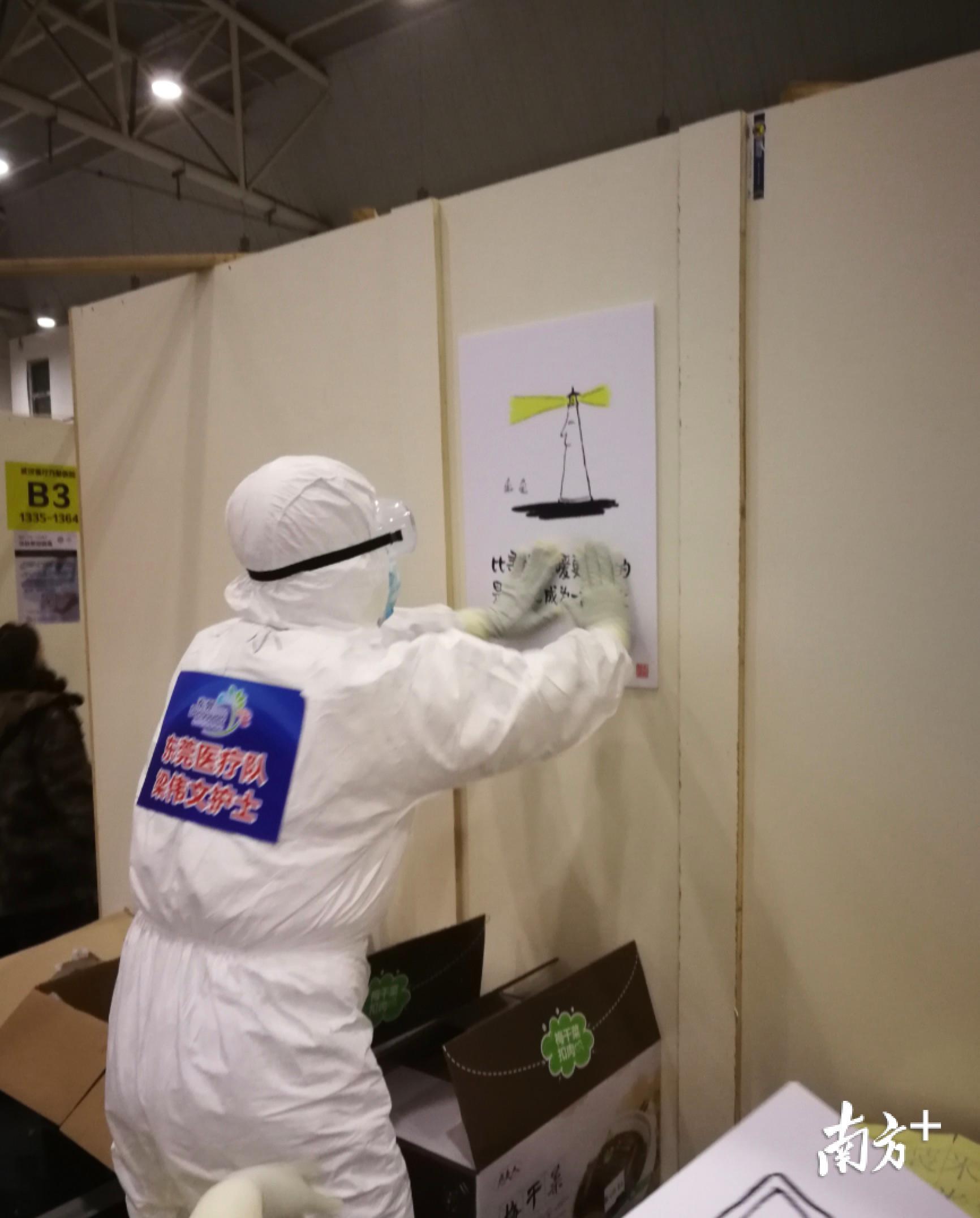 “队员们坚持尽早贴完,但在方舱内多呆10分钟,耗氧量很大,对他们的体力也是巨大的考验。”东莞市第二批援助湖北医疗队队长师清莲说,这样的做法不仅得到了指挥部的支持和点赞,也让患者们分外感动。方舱内的患者华磊将部分漫画拍下来,发到了自己的《方舱日记》中,短短时间内就超过了60万点击量。