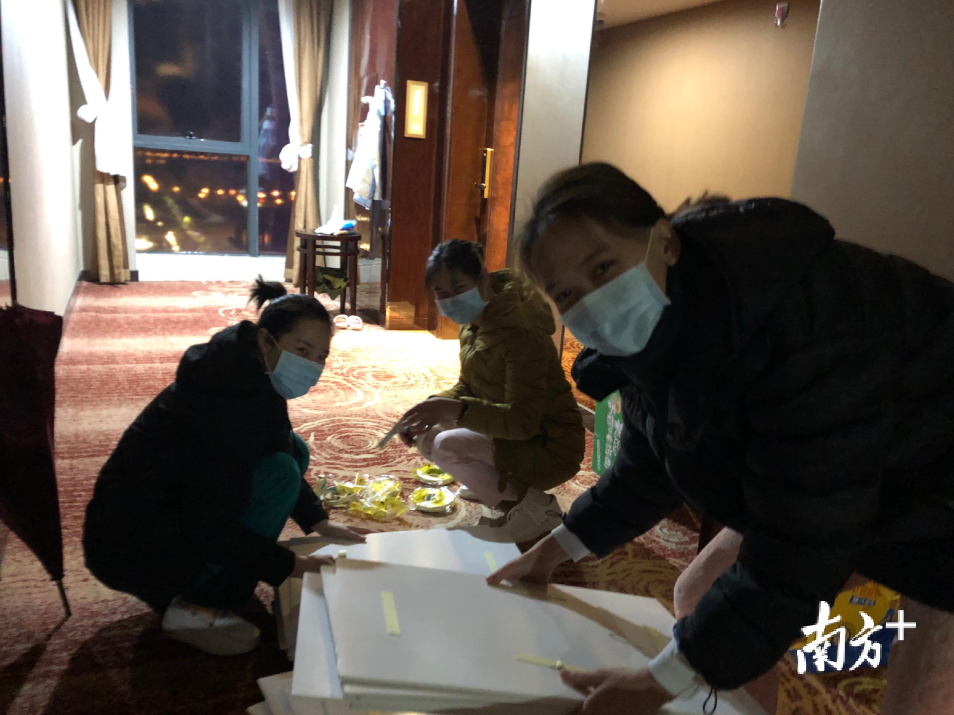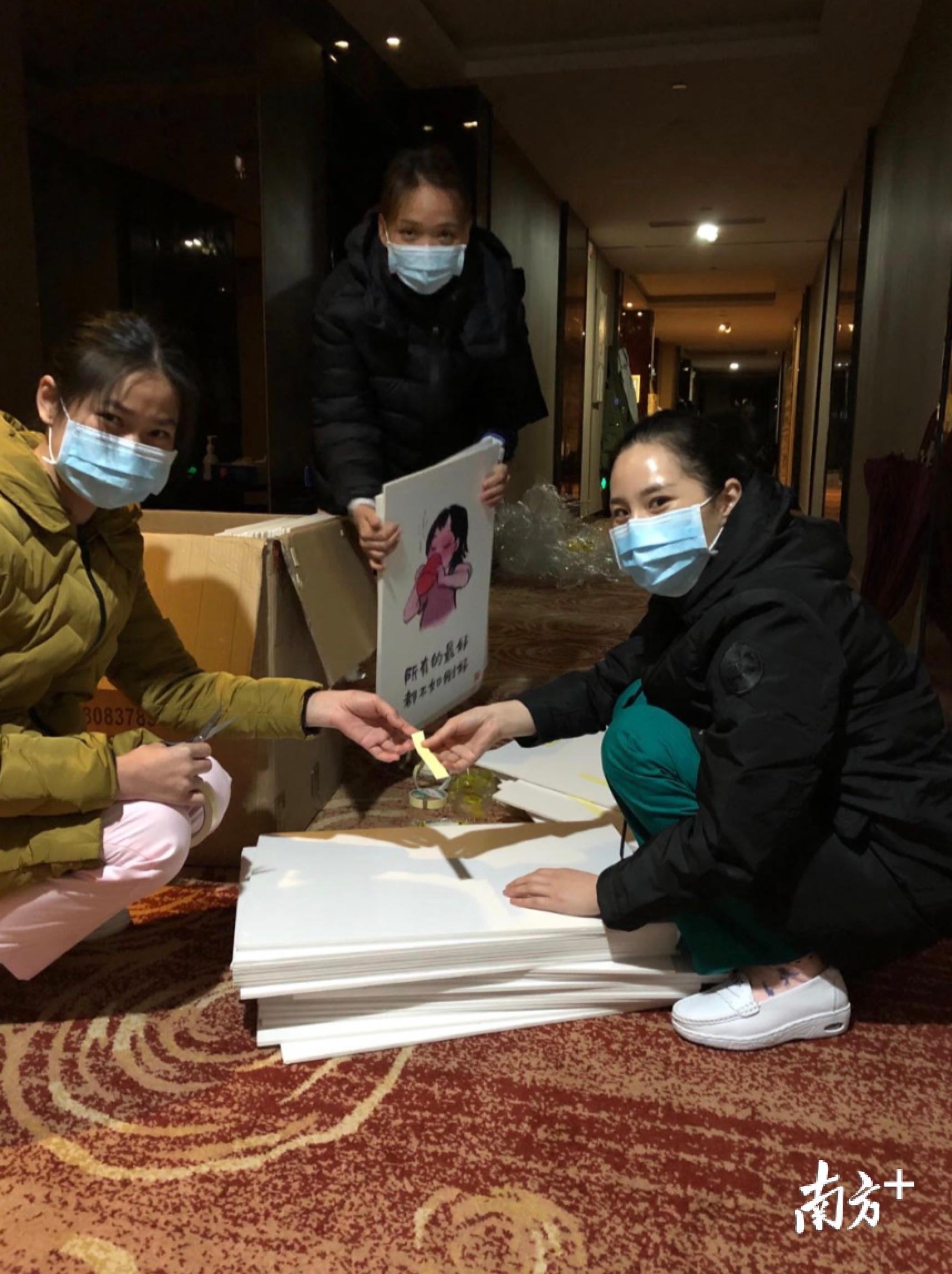 2月19日下午,这批特殊的“礼物”到货了。为了让方舱内的患者尽快得到正能量的鼓舞,东莞医疗队连夜在酒店走廊上为漫画背面张贴上双面胶,做好准备工作。当天晚上,5位值班的队员利用下班时间,与舱内的患者们共同完成了A区内50张漫画的张贴。其余的漫画,队员们也从今早陆续带入方舱,贴到了另外两个区。