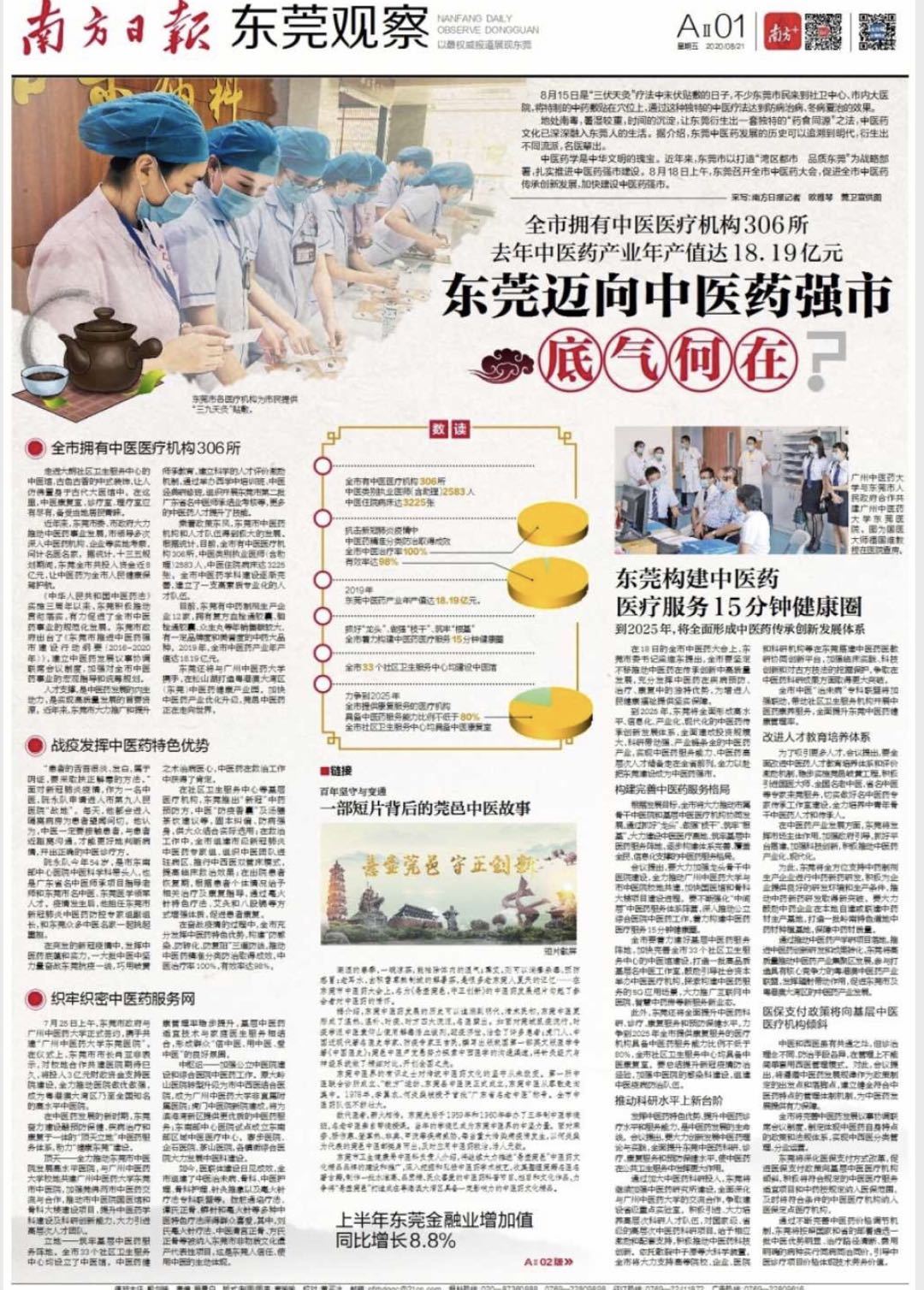 在中医药发展的新时期,东莞奋力建设融预防保健、疾病治疗和康复于一体的“顶天立地”中医药服务体系,助力“健康东莞”建设。