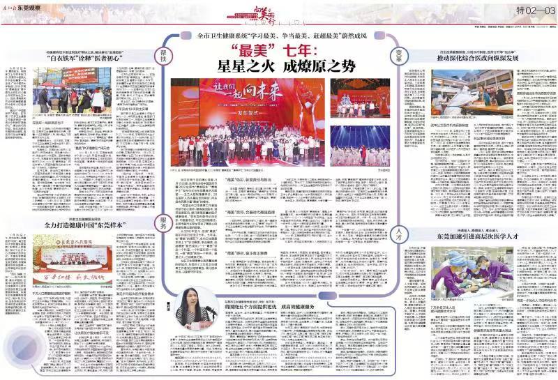 “最美”是医疗行业的标杆榜样。以“最美”为引领,东莞卫生健康系统好人云涌、模范辈出,“白衣铁军”形象扎根人心、凝聚力量,汇聚起全市人民齐心协力促发展的磅礴气势,奋起干事创业之志,在历史洪流中挺立潮头。