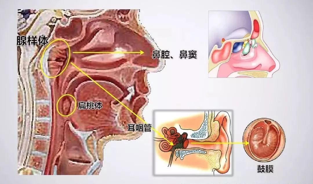 咽扁桃体,又称腺样体,位于咽穹后部,鼻咽的顶壁和后壁交界处。每个孩子在刚出生时都会有这个小小的器官,在正常生理情况下,6~7岁发育至最大,青春期后逐渐萎缩,成人则基本消失,不会再出现反复发炎感染等情况。