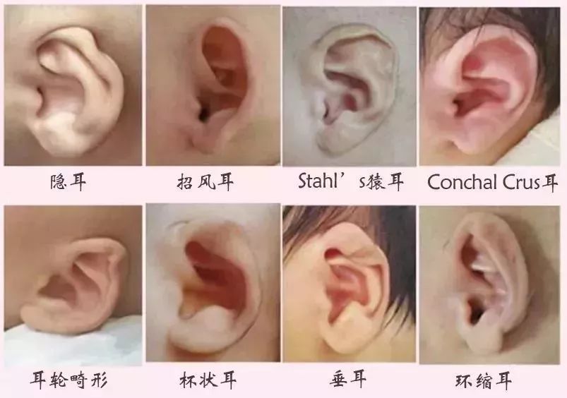 新生儿先天耳廓畸形是常见的出生体表缺陷。除了招风耳,耳廓形态畸形还包括垂耳、隐耳、杯状耳、环缩耳、stahl’s猿耳等。这边网络有点卡,我传照片对比图给你们辨认!